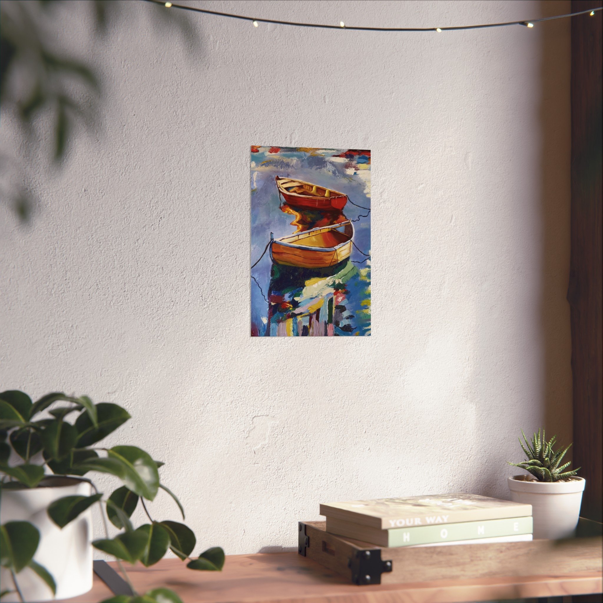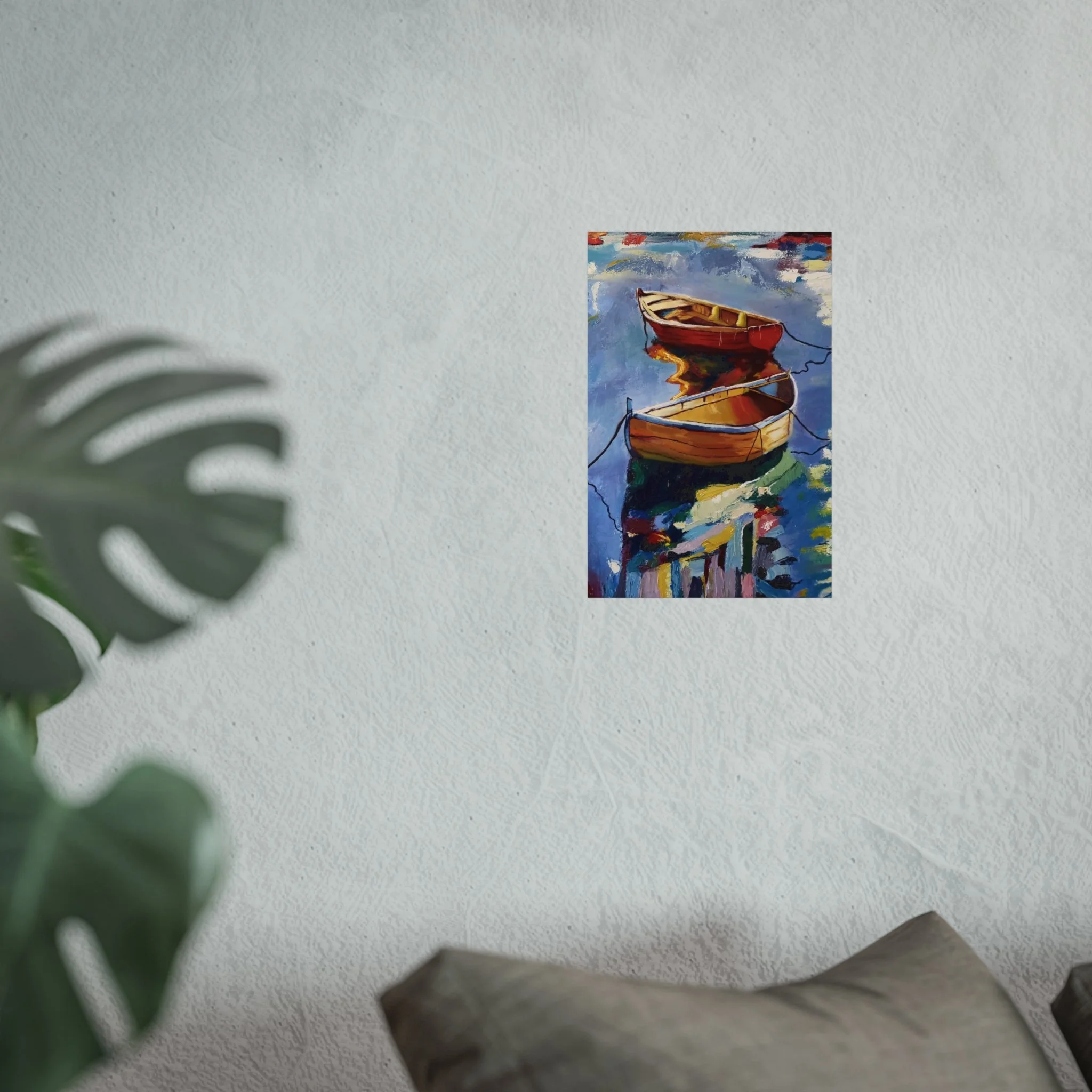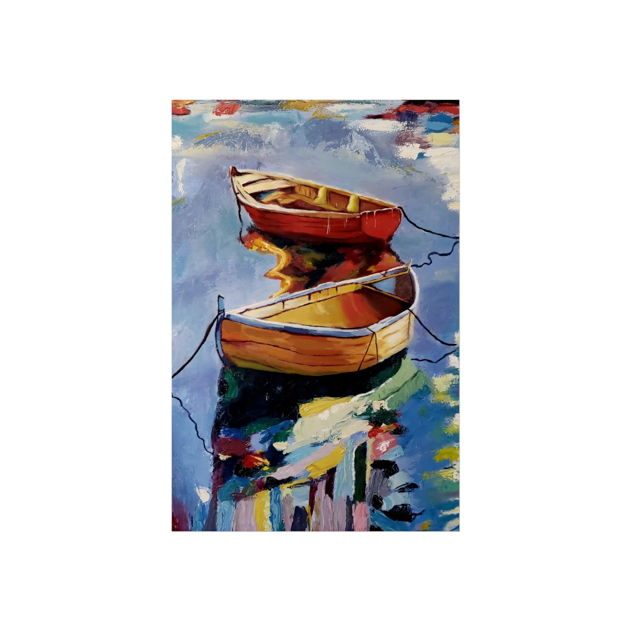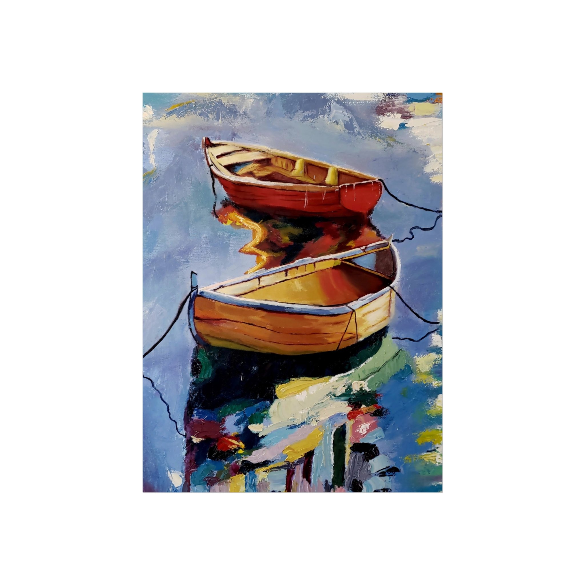 Gentle oars, bright hulls, and shimmering reflections — this fine art poster brings a quiet harbor scene into your living space. Printed with giclée quality on smooth, gallery-grade 220 gsm acid-free paper, the matte finish preserves rich, painterly colors without glare. The composition’s warm reds and golds against cool water tones create a calm focal point for a reading nook, coastal-themed room, or studio wall. It hangs easily in horizontal, vertical, or square arrangements and is available in multiple sizes to suit small corners or larger gallery-style displays. Every print is made using REACH-certified inks on responsibly sourced materials, so the piece looks beautiful and feels thoughtfully produced.