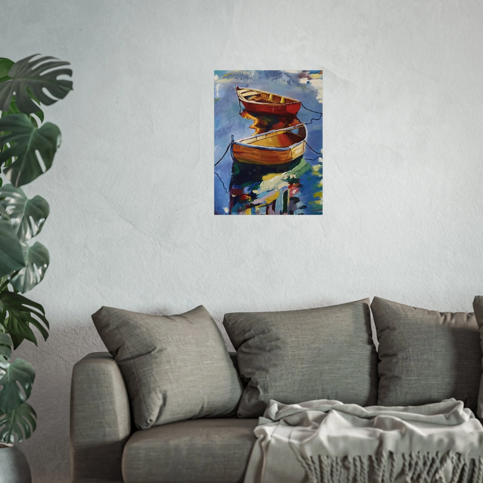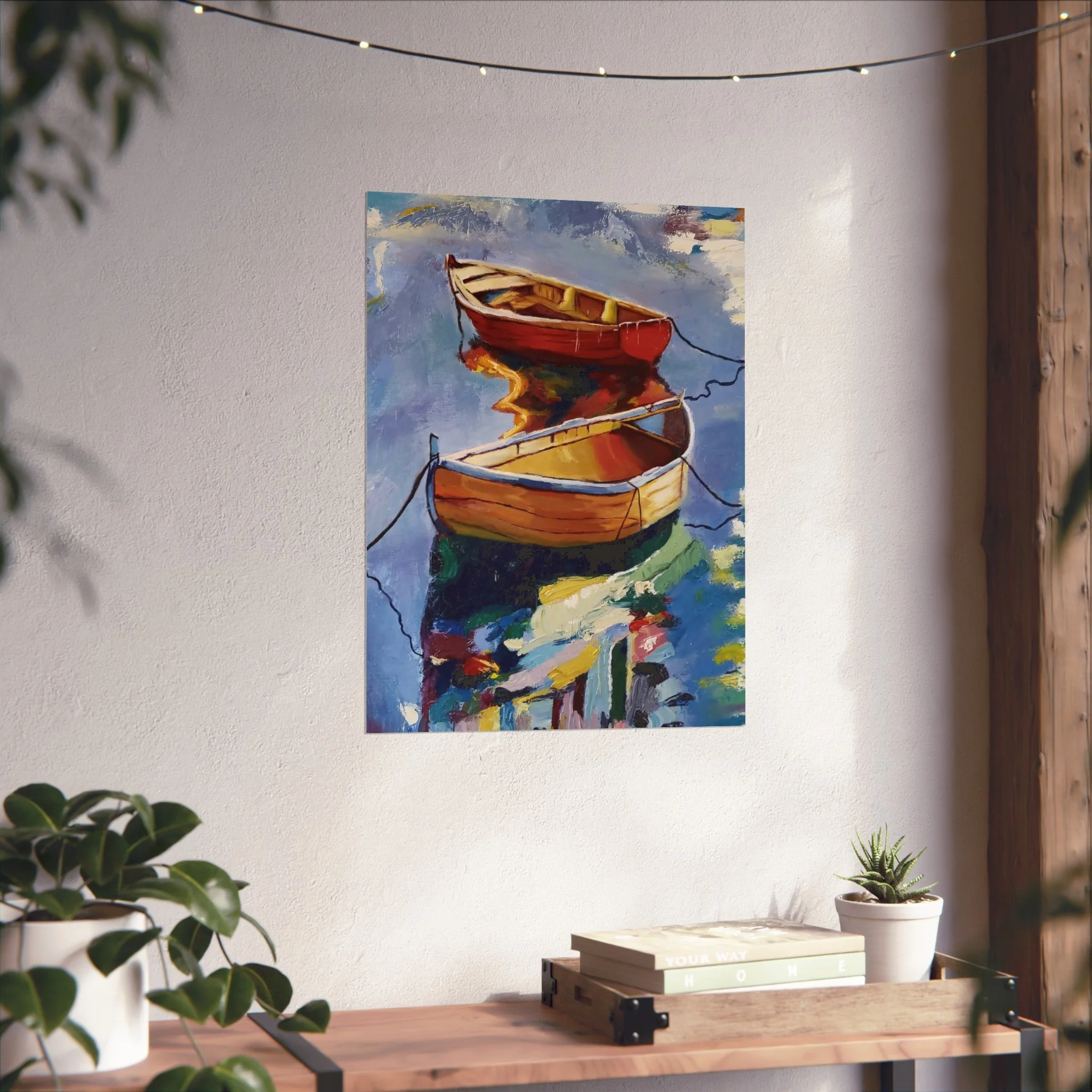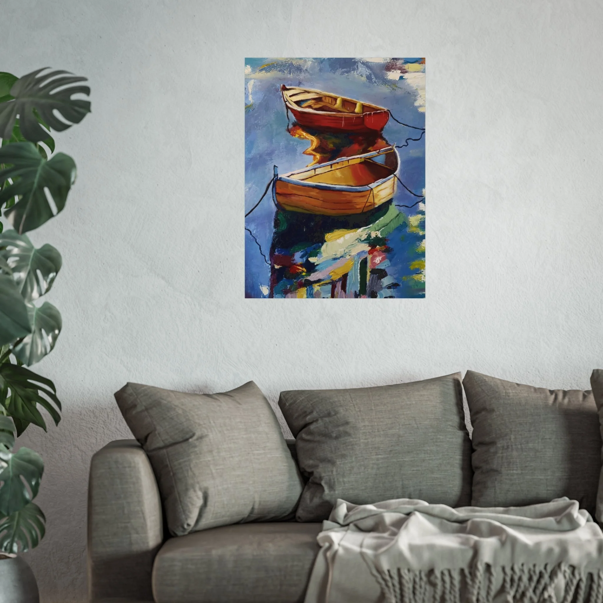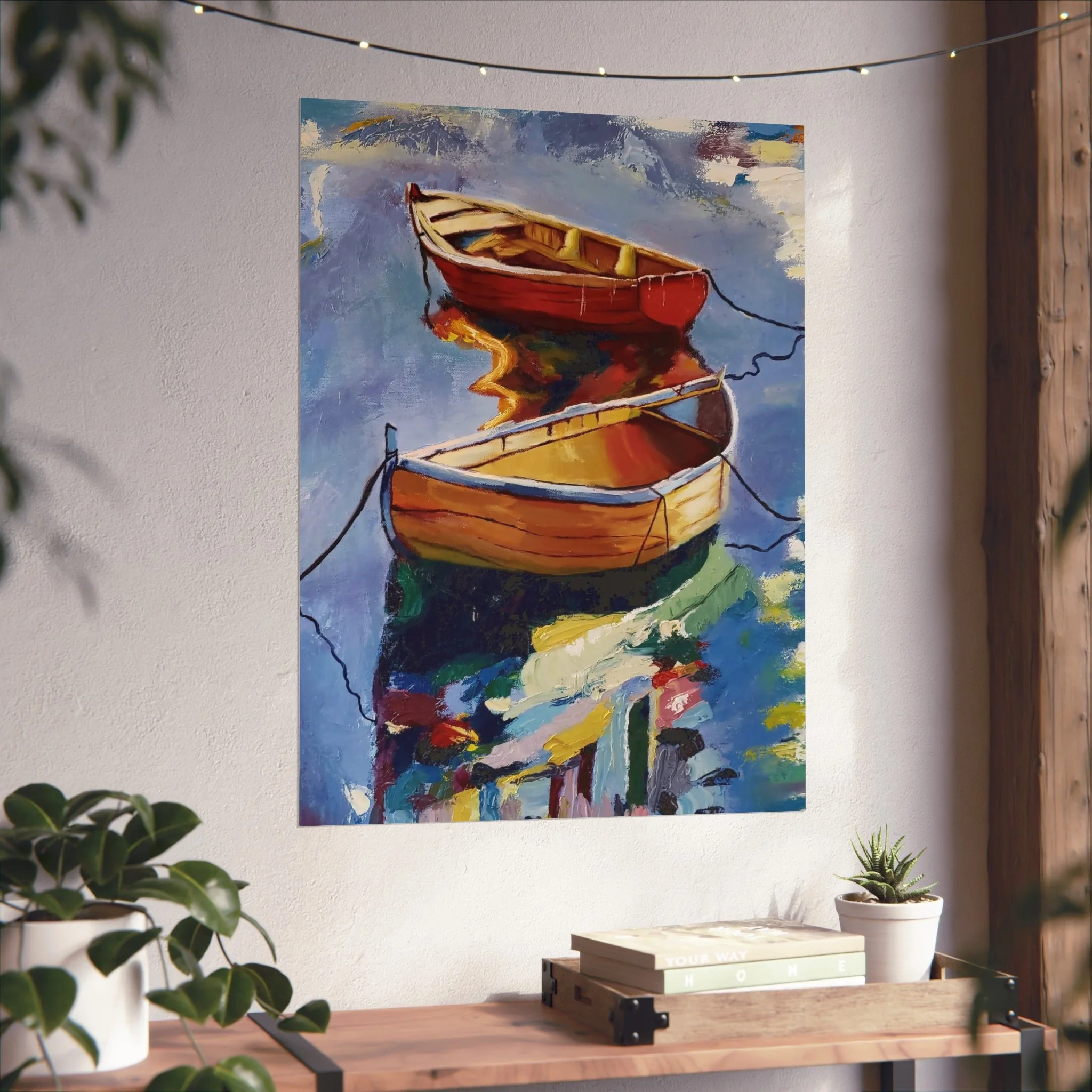 Gentle oars, bright hulls, and shimmering reflections — this fine art poster brings a quiet harbor scene into your living space. Printed with giclée quality on smooth, gallery-grade 220 gsm acid-free paper, the matte finish preserves rich, painterly colors without glare. The composition’s warm reds and golds against cool water tones create a calm focal point for a reading nook, coastal-themed room, or studio wall. It hangs easily in horizontal, vertical, or square arrangements and is available in multiple sizes to suit small corners or larger gallery-style displays. Every print is made using REACH-certified inks on responsibly sourced materials, so the piece looks beautiful and feels thoughtfully produced.