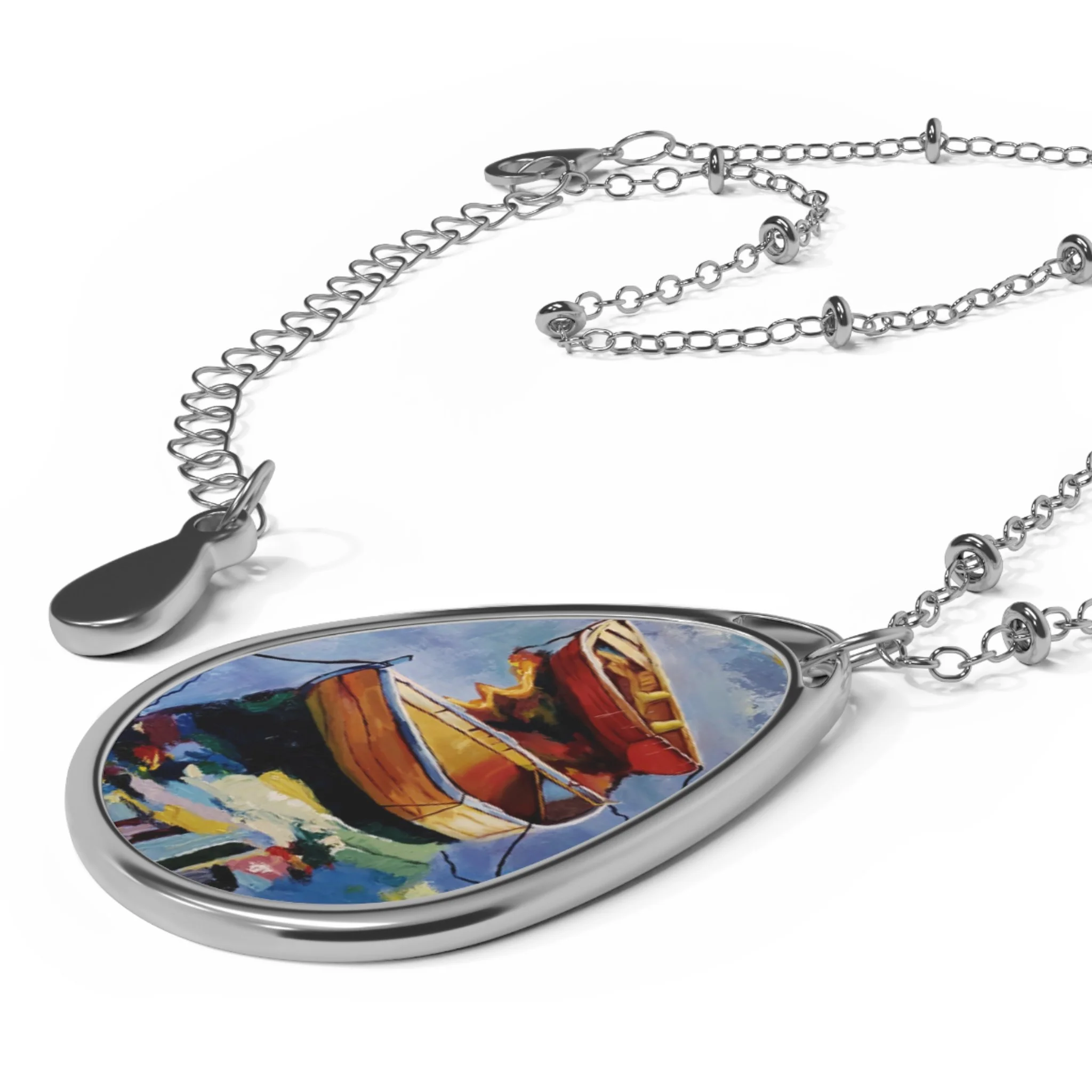 Oval Pendant Necklace — Colorful Rowboat Art Teardrop Locket